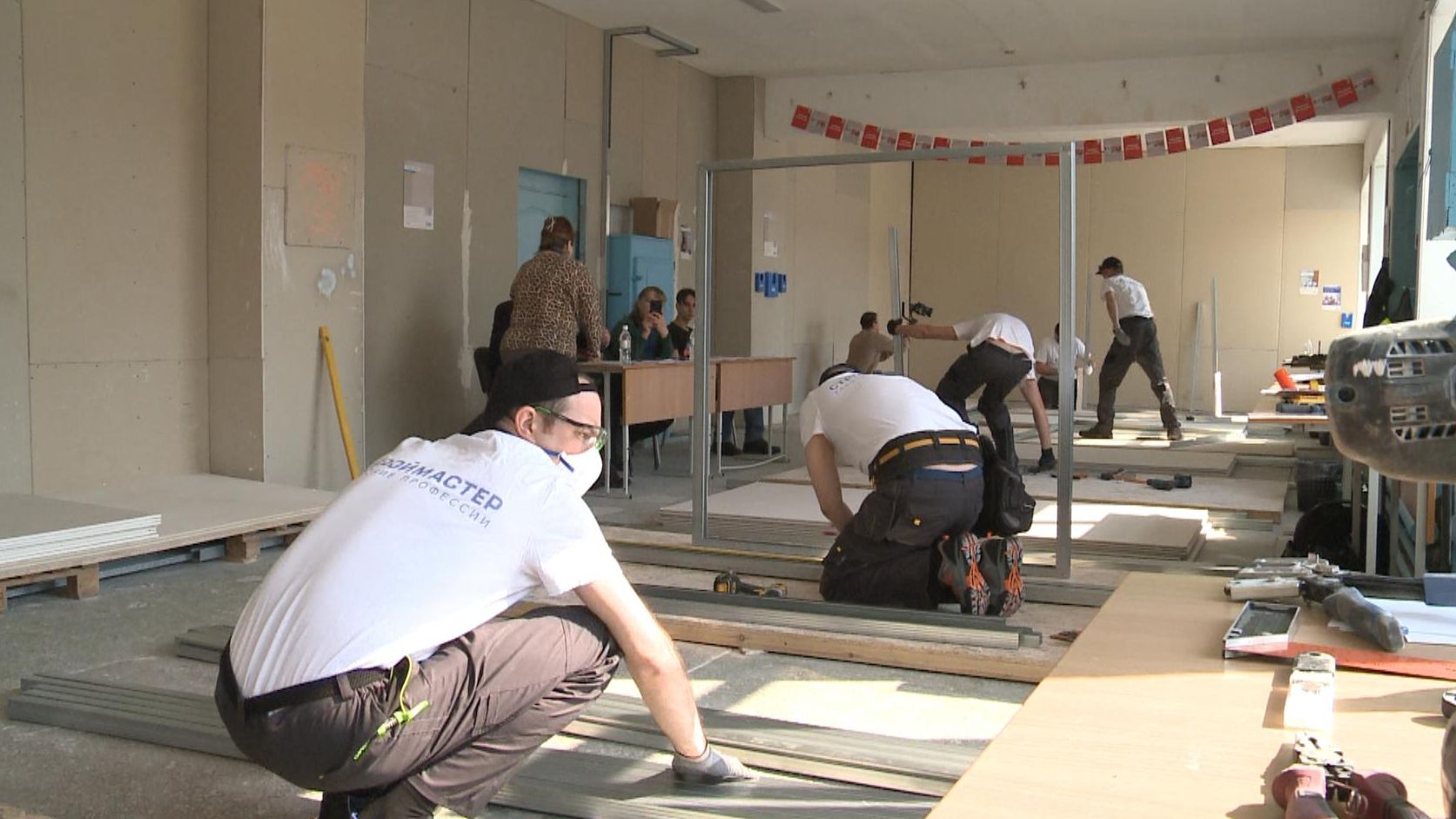 По соседству за золото в региональном конкурсе соревнуются монтажники. Если сварщикам нужно правильно соединить 2 пластины за 90 минут, то их коллегам — собрать перегородку, оконный откос и короб за 5 часов.