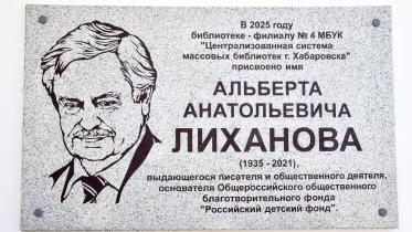 На фасаде муниципальной библиотеки-филиала № 4 в Хабаровске установлена памятная таблица в честь известного писателя и общественного деятеля Альберта Лиханова. В этом году отмечается 90-летие со дня его рождения. Мемориальную доску открыл глава города Сергей Кравчук.